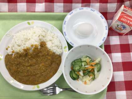 「キーマカレーライス、フレンチサラダ、茹で卵、牛乳」です。