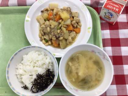 「ごはん、ひじきのふりかけ、じゃが芋のそぼろ煮、豆腐とわかめの味噌汁、牛乳」です。