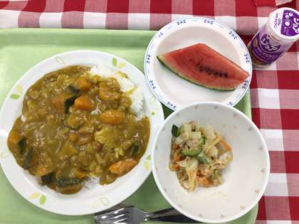 「横須賀夏カレーライス、三崎サラダ、西瓜、牛乳」です。