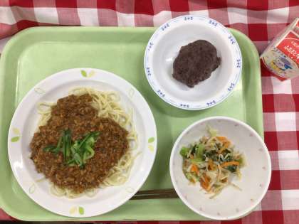 「ジャージャン麺、もやしの中華サラダ、お萩、牛乳」です。