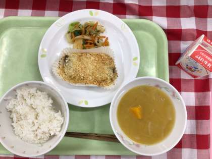 「麦ごはん、鯵のガーリック焼き、野菜のおかかかけ、南瓜の味噌汁、牛乳」です。