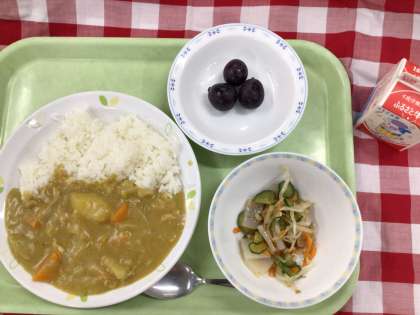 「ココナツチキンカレーライス、こんにゃくサラダ、巨峰、牛乳」です。