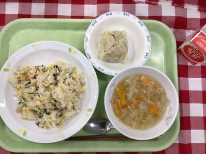 「青菜の炒飯、ジャンボ焼売、、白菜のスープ、牛乳」です。