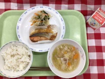 「麦ごはん、鮭の味噌マヨネーズ焼き、和風サラダ、豆腐汁、牛乳」です。