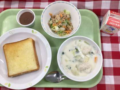 「ガーリックトースト、肉団子入りシチュー、ツナサラダ、ココアプリン、牛乳」です。
