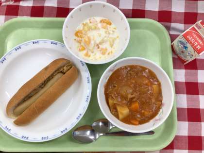 「ホットドッグ、トマトシチュー、フルーツヨーグルト、牛乳」です。