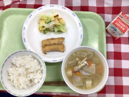 「麦ごはん、いかの香味焼き、りんごと白菜のサラダ、豚汁、牛乳」です。