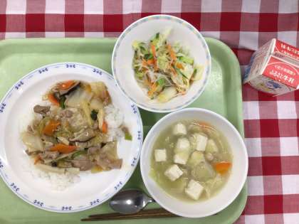 「中華丼、春雨サラダ、豆腐スープ、牛乳」です。