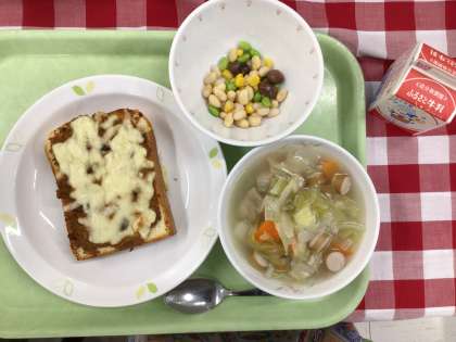 「ミートチーズトースト、ポトフ、ビーンズサラダ、牛乳」です。