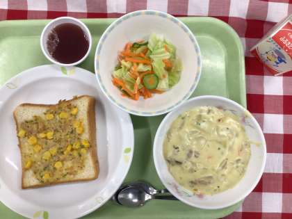 「ツナコーントースト、フレンチサラダ、パンプキンシチュー、ぶどうゼリー、牛乳」です。