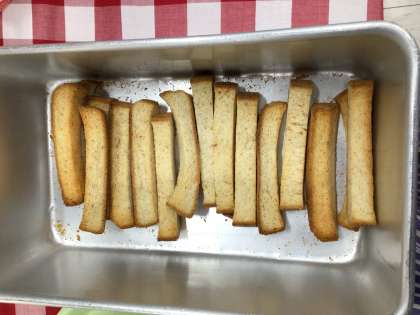 お日様が隠れて肌寒い1日になりました。今日は、地球に優しいSDGsの取り組みとして胚芽食パンの耳をスティック状に切り、オーブンで焼いて各クラスに配ってみました。