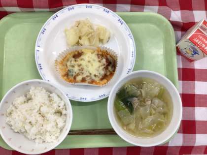 「麦ごはん、鰯のピザ風焼き、ジャーマンポテト、キャベツのスープ、牛乳」です。