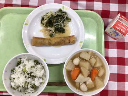 「じゃこ菜めし、せたがやおでん、棒餃子、和風サラダ、牛乳」です。