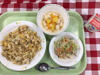 「坦々ピリ辛炒飯、(バンサンスー)、杏仁豆腐、牛乳」です。