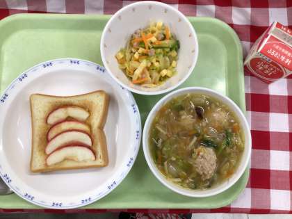 「アップルシナモントースト、イタリアンサラダ、白菜と肉団子のスープ、牛乳」です。