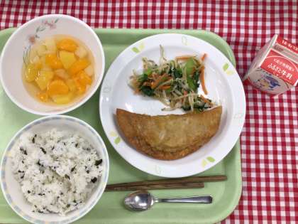 「わかめごはん、ジャンボ餃子、野菜の辛子醤油かけ、フルーツポンチ、牛乳」です。