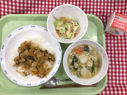 「タッカルビ丼、春雨サラダ、卵雑煮、牛乳」です。