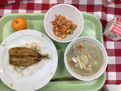 「鰯の蒲焼丼、キャロットラペ、呉汁、ぽんかん、牛乳」です。