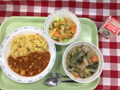 「チリビーンズライス、パリパリたっぷりサラダ、白菜スープ、牛乳」です。