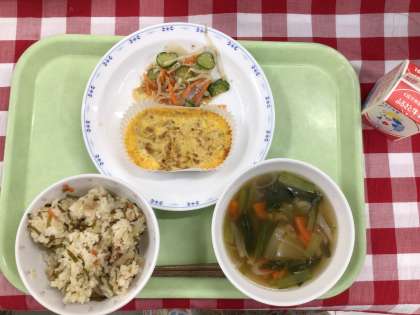 「鶏牛蒡ごはん、切干大根の卵焼き、蒟蒻サラダ、あんかけ汁、牛乳」です。
