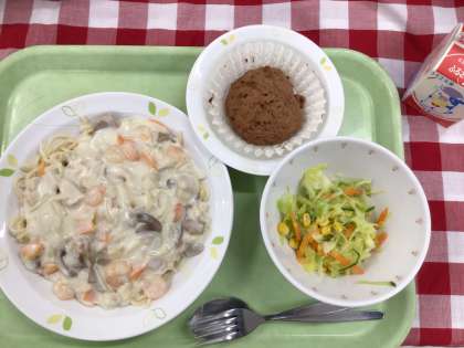 「スパゲティクリームソース、コールスローサラダ、おからマフィン、牛乳」です。