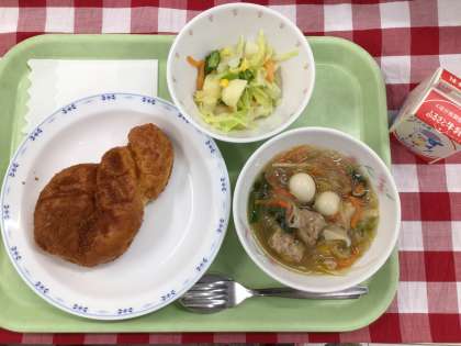 「シナモン揚げパン、ポテト入りフレンチサラダ、肉団子入り春雨スープ、牛乳」です。