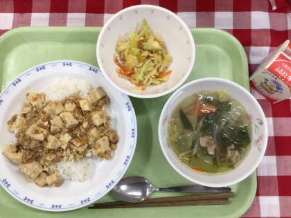 「麻婆豆腐丼、野菜の中華風味、中華スープ、牛乳」です。