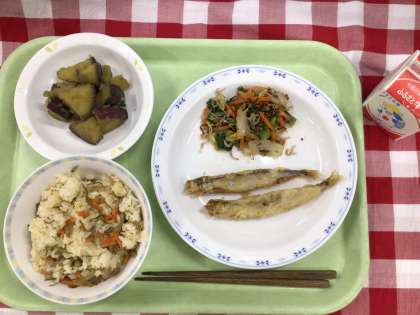 「豚肉と牛蒡のごはん、ししゃもの天ぷら、野菜の乾物和え、さつま芋の甘辛煮、牛乳」です。