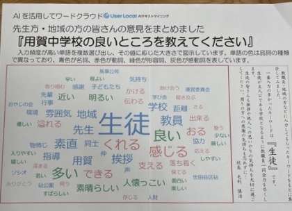 着任してすぐに教職員及び地域の方にアンケートをとってみました。内容は用賀中学校の良いところを教えてくださいという内容です。