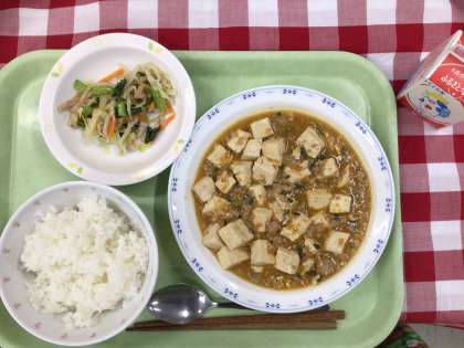 「ごはん、麻婆豆腐、もやしの中華サラダ、牛乳」です。