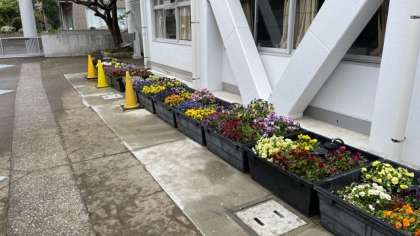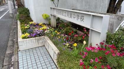 用賀中学校の学校周辺にたくさんの花が植えてあります。