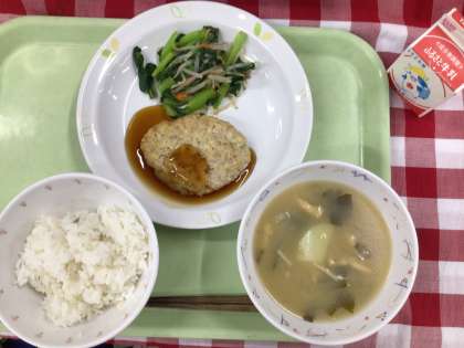 「麦ごはん、豆腐入りさくさくつくね、野菜の辛子醤油かけ、味噌汁、牛乳」です。