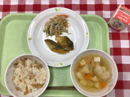 「筍ごはん、鯖のカレー揚げ、野菜のごま酢かけ、豆腐汁」です。