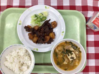 「麦ごはん、レバーとポテトのマリアナソース、野菜のひと塩、豆腐チゲ、牛乳」です。