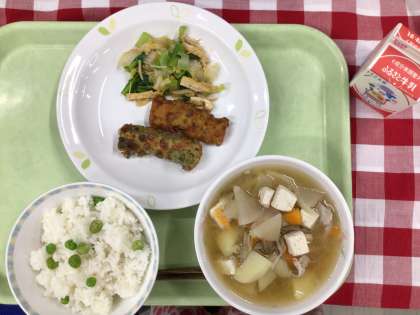 「グリンピースごはん、、竹輪の二色揚げ、きのこ入り煮浸し、豚汁、牛乳」です。