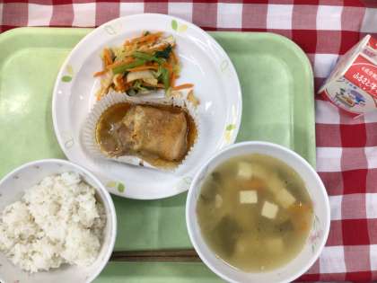 「麦ごはん、鶏肉の照焼、青菜と揚げのおひたし、わかめスープ、牛乳」です。