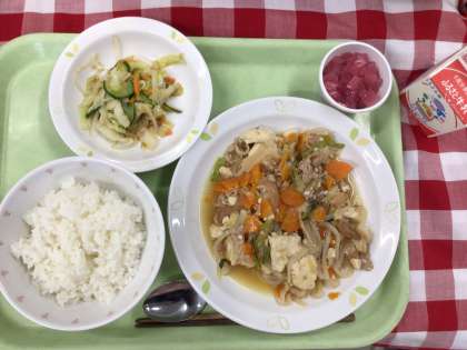 「ごはん、すき焼き煮、梅ドレサラダ、紫陽花ゼリー、牛乳」です。