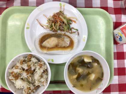「豆ごはん、白身魚のステーキソース、噛み噛みサラダ、じゃが芋の味噌汁、牛乳」です。