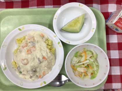 「ドリア、キャベツと大根のサラダ、メロン、牛乳」です。