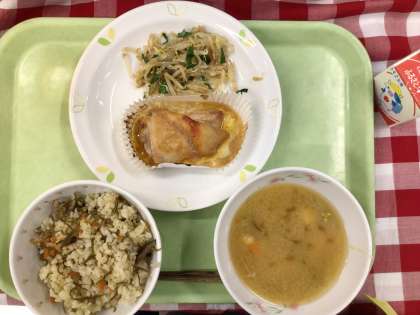 「ししじゅうしい、鶏肉の梅肉焼き、もやしのごま風味、豆腐とわかめの味噌汁、牛乳」です。