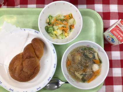 「シナモン揚げパン、ポテト入りフレンチサラダ、春雨スープ、牛乳」です。