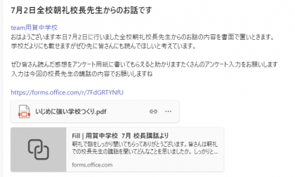 全校朝礼、校長先生の講話を聞いてのアンケートです。