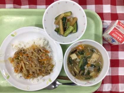 「スタミナ丼、胡瓜と大根の中華漬け、ワンタンスープ、牛乳」です。