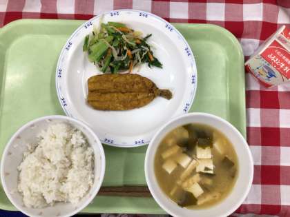 「麦ごはん、鰯のカレー揚げ、青菜の胡麻和え、味噌汁、牛乳」です。
