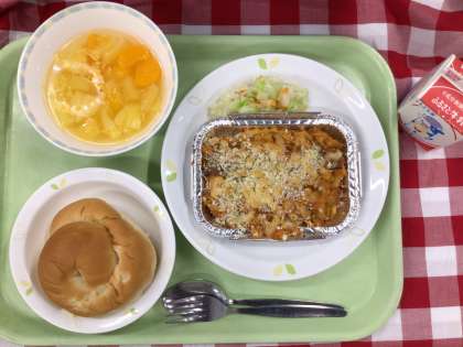 「パインパン、ラザニア風、キャベツサラダ、フルーツポンチ、牛乳」です。