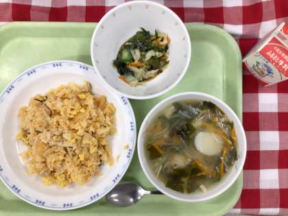 「タッカルビ炒飯、わかめサラダ、トックスープ、牛乳」です。