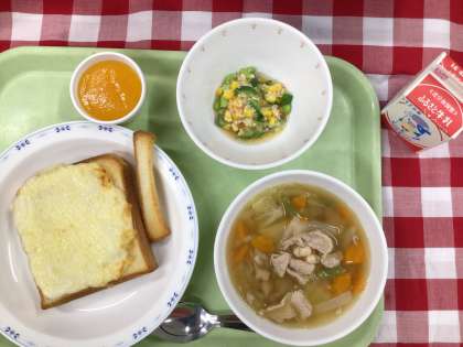 「クロックムッシュ風トースト、タブレ、白いんげん豆の田舎風スープ、ブラマンジェピーチソース、牛乳」です。