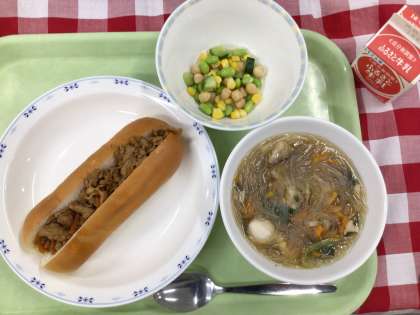 「プルコギサンド、コロコロ豆サラダ、春雨スープ、牛乳」です。