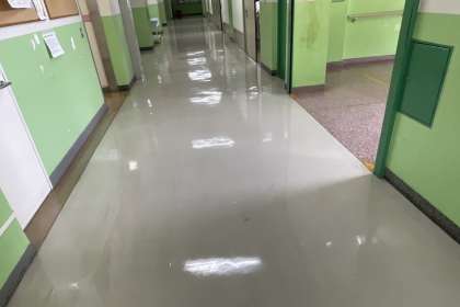 この時期に、学校では廊下のワックスがけを学校業務委託ソシオ株式会社の皆さんに行っていただきました