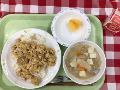 「フーチャンプル丼、粕汁、柿、牛乳」です。